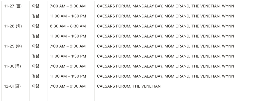 아무래도 라스베가스 현지에서 업무를 보셔야 하는 분들도 계실 텐데요. 라스베가스는 서울보다 17시간 빠릅니다. 시간 계산은 라스베가스 기준으로 5시간을 더하고 낮밤을 바꿔주면 되는데, 예를 들어 라스베가스에서 밤 11시라면 5시간을 더해서 새벽 4시가 되죠. 여기에 낮밤을 바꿔주면 한국은 16시라고 생각하시면 되는 겁니다. 생각보다 겹치는 시간이 많아서 세션을 듣다가 슬랙 메시지 확인도 종종 했네요(티는 안 냈지만).