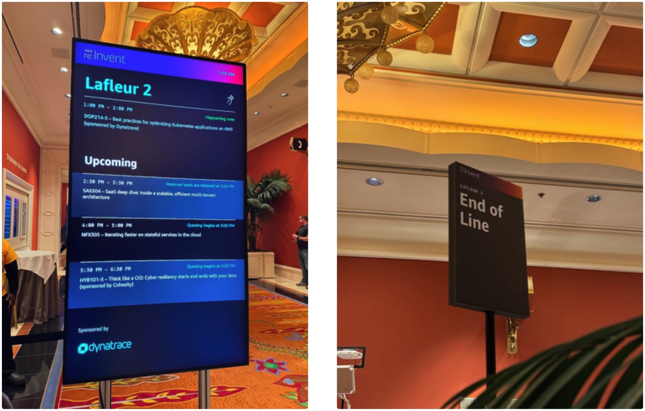 세션에 들어가는 방법은 두 가지입니다. 첫 번째는 미리 Reserved 하는 거고, 이렇게 예약하지 못했다면 walk-up 하는 겁니다. 예약했다고 하더라도 세션장에 10~20분 전에 도착하지 못하면 그 자리는 그대로 release 됩니다. 그리고 walk-up 하는 사람들에게 돌아가는 거죠. 얼핏 듣기로 walk-up을 위한 자리가 20% 정도 된다고 하니 꼭 듣고 싶은 세션이라면 미리 가서 줄을 서 있으면 됩니다. 최소 30분 전에는 줄을 서야 안전하게 들어갈 수 있을 겁니다. End of Line이 있다면 더 이상 줄을 서 있을 필요가 없습니다. 어차피 못 들어갈 테니까요.