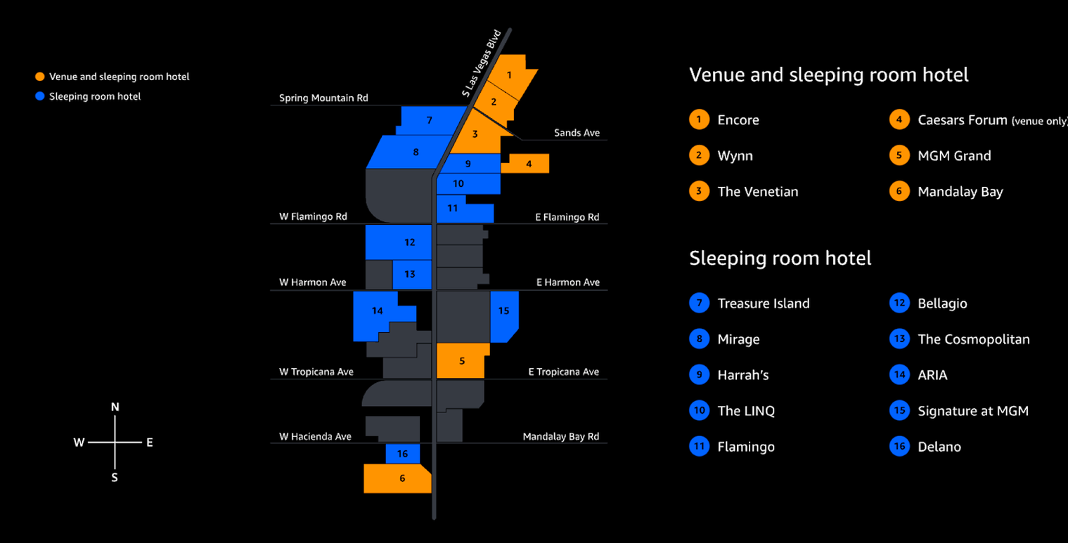 리인벤트가 진행되는 장소는 라스베가스 스트립으로 물가가 꽤 비싼 편입니다. 대체로 라스베가스는 물가가 저렴하다고 하는데 딱 이곳 스트립만 비싸다고 하네요. 아무래도 워낙 유명한 관광지라서 그런 것 같습니다. 그럼 리인벤트 베뉴 위치를 살펴볼까요? 아래 지도를 봐주세요. 주황색과 파란색으로 나눠지는데 베뉴는 주황색입니다. 그중에도 3번 베네시안은 키노트 행사가 진행되는 만큼 메인 행사장이라고 볼 수 있습니다. 가장 규모가 크기도 하고요. 파란색으로 표기된 호텔은 행사가 있진 않습니다. 그리고 색상 표기가 없는 곳에도 호텔이 있어요. 그럼 파란색으로 색칠된 호텔은 무엇이 다르냐는 건데 행사 마지막날 re:Play 파티를 갈 때 파란색 호텔에서도 버스를 운행합니다. 지도에 표시되지 않은 호텔에는 버스 운행이 없습니다. 저는 시저스 팰리스(8번과 12번 사이)에 묶었는데 버스가 없어서 가까운 벨라지오(12)로 넘어가서 버스를 탔네요.