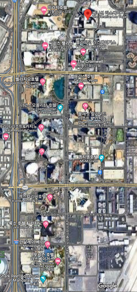 아래 위성지도로 봐주시면 거리가 대충 짐작되실 겁니다. 3번 베네시안에서 6번 만달레이베이까지 거리를 가늠해 보세요. 절대 걸어 갈 수 있는 거리가 아닙니다. 리인벤트에서 제공하는 캠퍼스 셔틀을 타도 최소 10~15분은 걸립니다.
