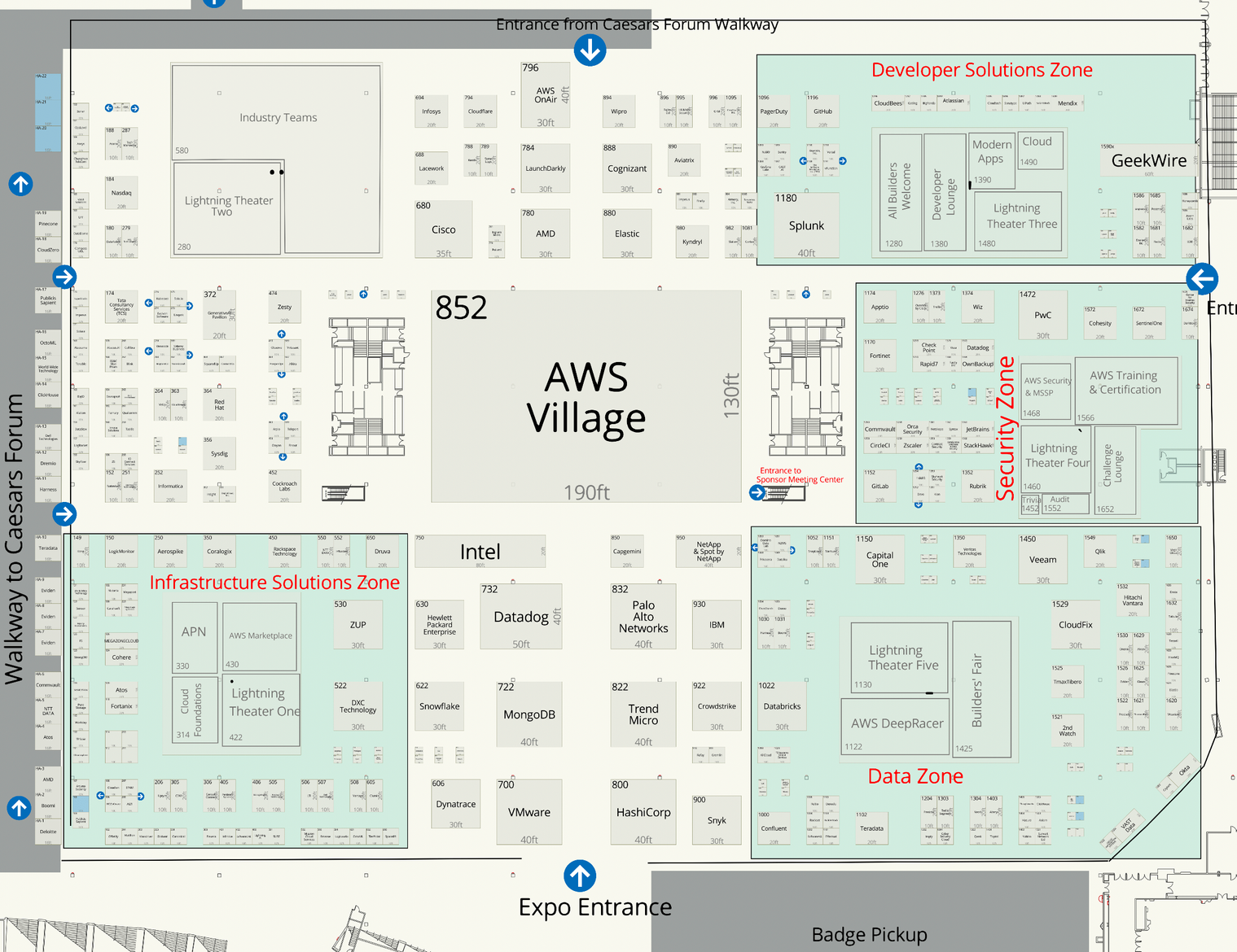 특별히 방문하고 싶은 부스가 있다면 엑스포 지도를 참고하시면 좋습니다. 매년 달라지기 때문에 AWS Events 앱을 통해 확인하실 수 있을 겁니다. 2023년 지도는 참고 차원으로 남겨둡니다. 얼마나 넓은 공간인지 가늠하실 수 있겠죠?