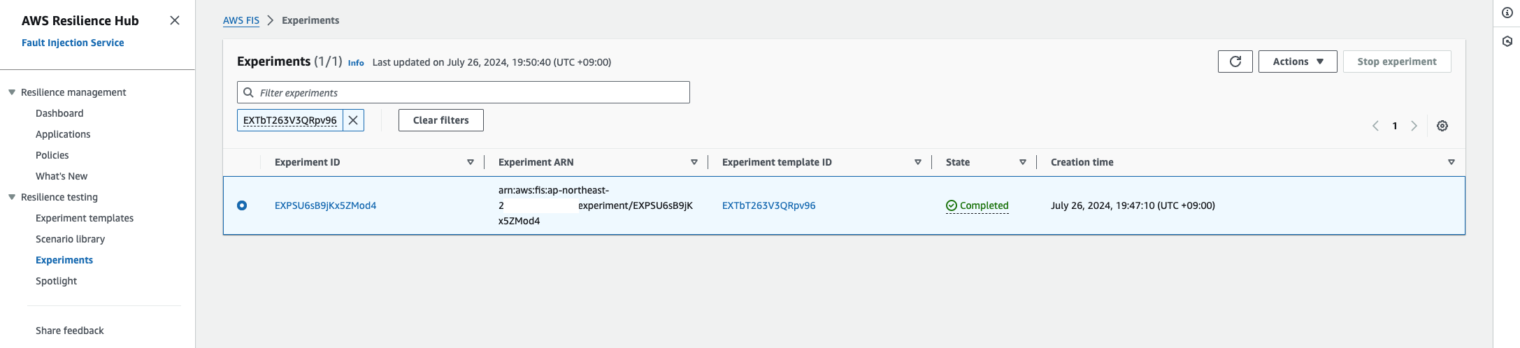 자, 확인이 끝났으면 Start experiment를 눌러줍니다. 그리고 이제 좌측 탭을 이동해서 Experiments를 통해 방금 실행시킨 템플릿의 결과를 확인할 수 있습니다.