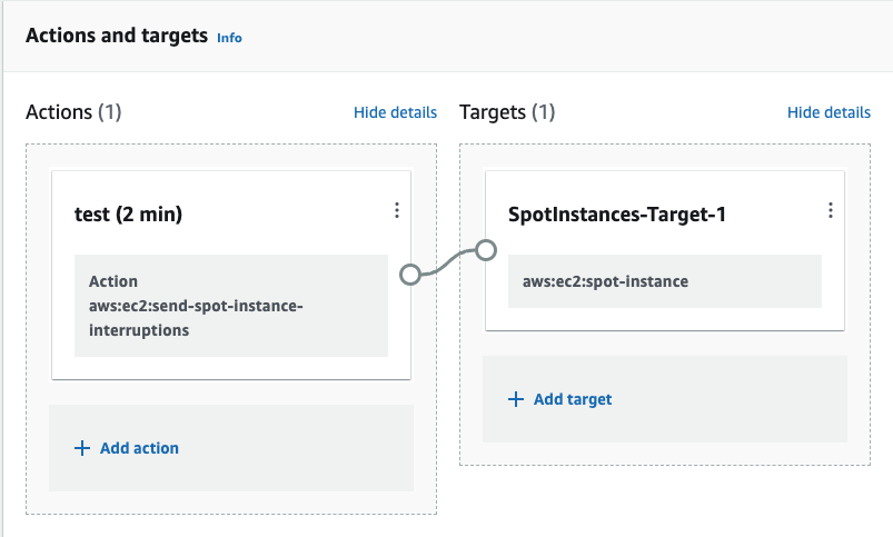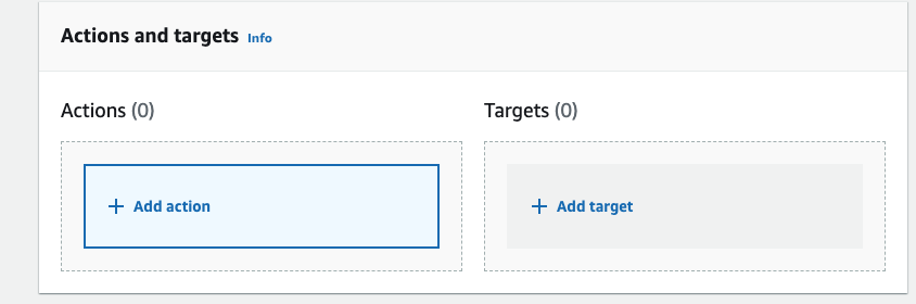 FIS에서 흔히 사용되는 Spot 인스턴스에 interruptions를 보내는 설정을 해보겠습니다. Actions and targets에서 Action을 지정하고 Target에 연결해 주면 되는데요. 우선 Add action(+)를 클릭합니다.