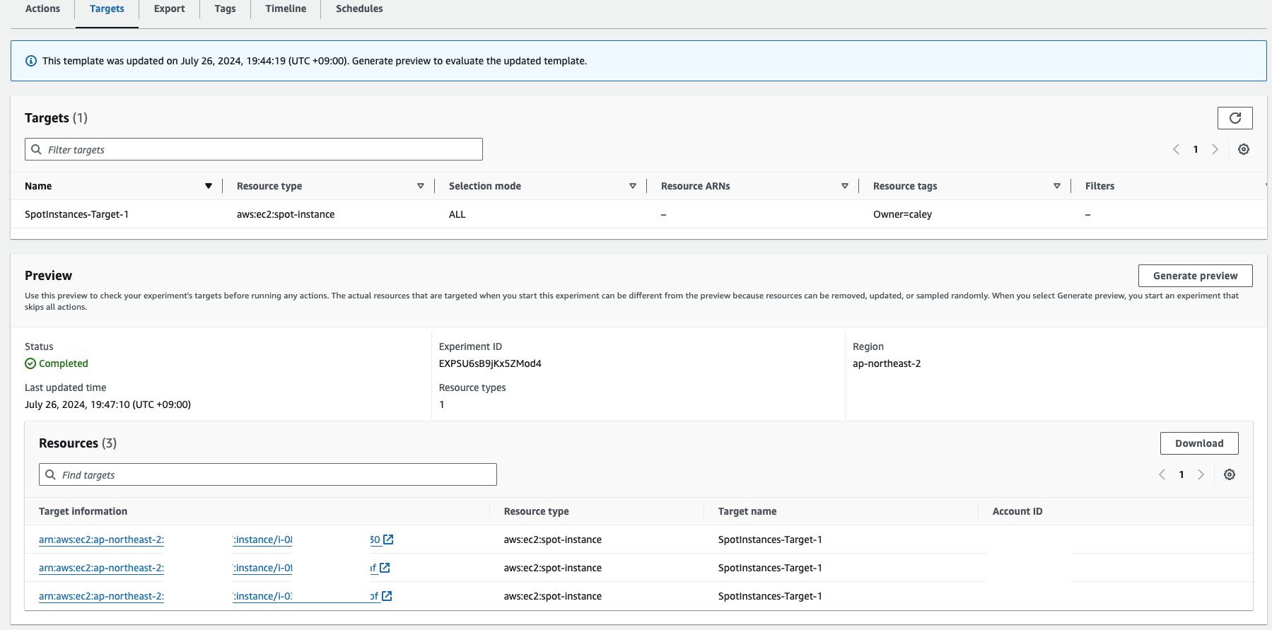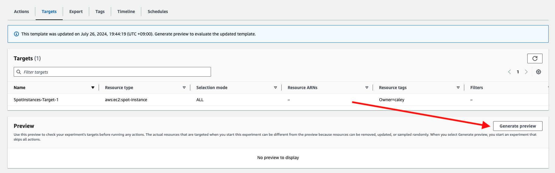우측 상단에 Start experiment를 누르고 싶은 마음도 있지만 설정이 정상적으로 된 것인지, 실제 실험을 시작했을 때 종료될 인스턴스는 무엇인지 dry-run 해볼 수 있다면 좋겠습니다. 다행히도 FIS에서는 어떤 타깃에 이벤트가 전달되는지 미리 볼 수 있습니다. 위에 이미지 중앙에 있는 Targets 탭으로 이동해서 Generate preview를 클릭합니다.
