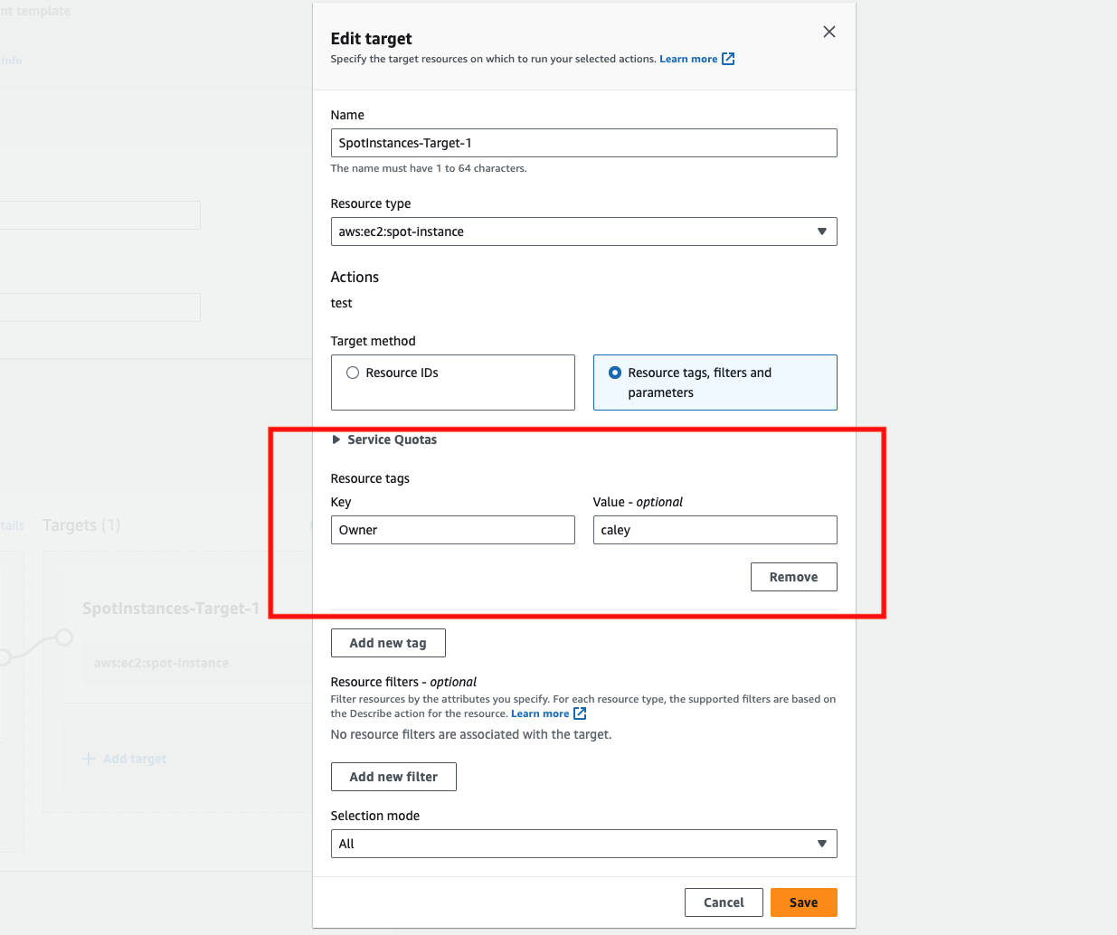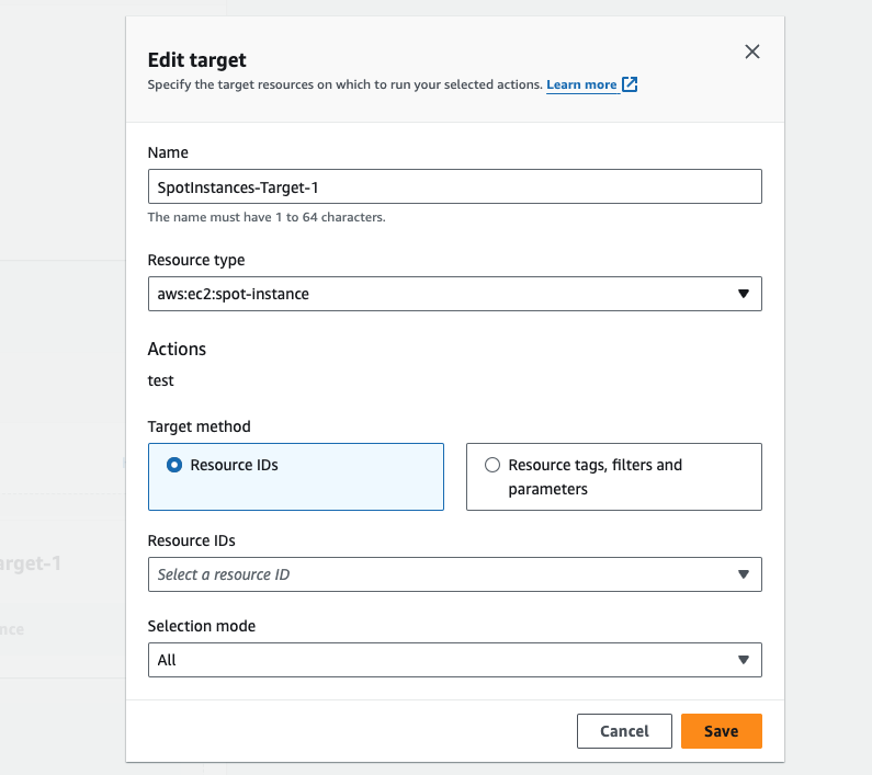 이제 SpotInstances-Target-1을 클릭해서 대상을 수정해 줍니다. 기본 설정은 아래와 같은데 Resource ID를 지정해서 복수로 체크할 수 있습니다. 만약 5개를 체크한 상태에서 Selection mode가 All이면 5개 모두에게 Action(spot interruption)이 전송됩니다. All이 아닌 Count로 2를 지정하게 되면 5개 중에 2개를 랜덤으로 선택해서 이벤트를 전송하게됩니다.