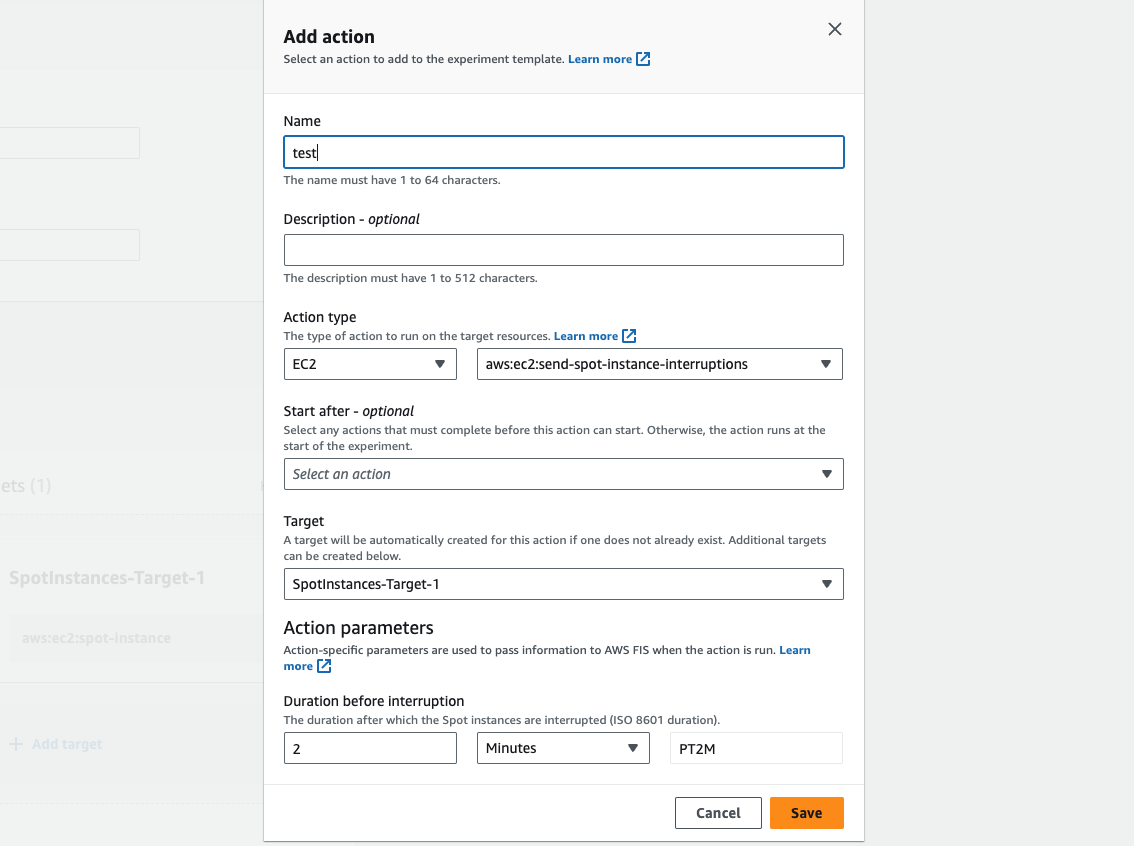 아래와 같이 설정해 줍니다. Action type을 EC2로 하고 send-spot-instance-interruptiops을 선택합니다. Duration before interruption은 2분으로 합니다. 실제 Spot 종료 전에 인스턴스가 받게 되는 interruption 이벤트가 2분 전에 수신되므로 같은 상황을 만들어주는 겁니다.
