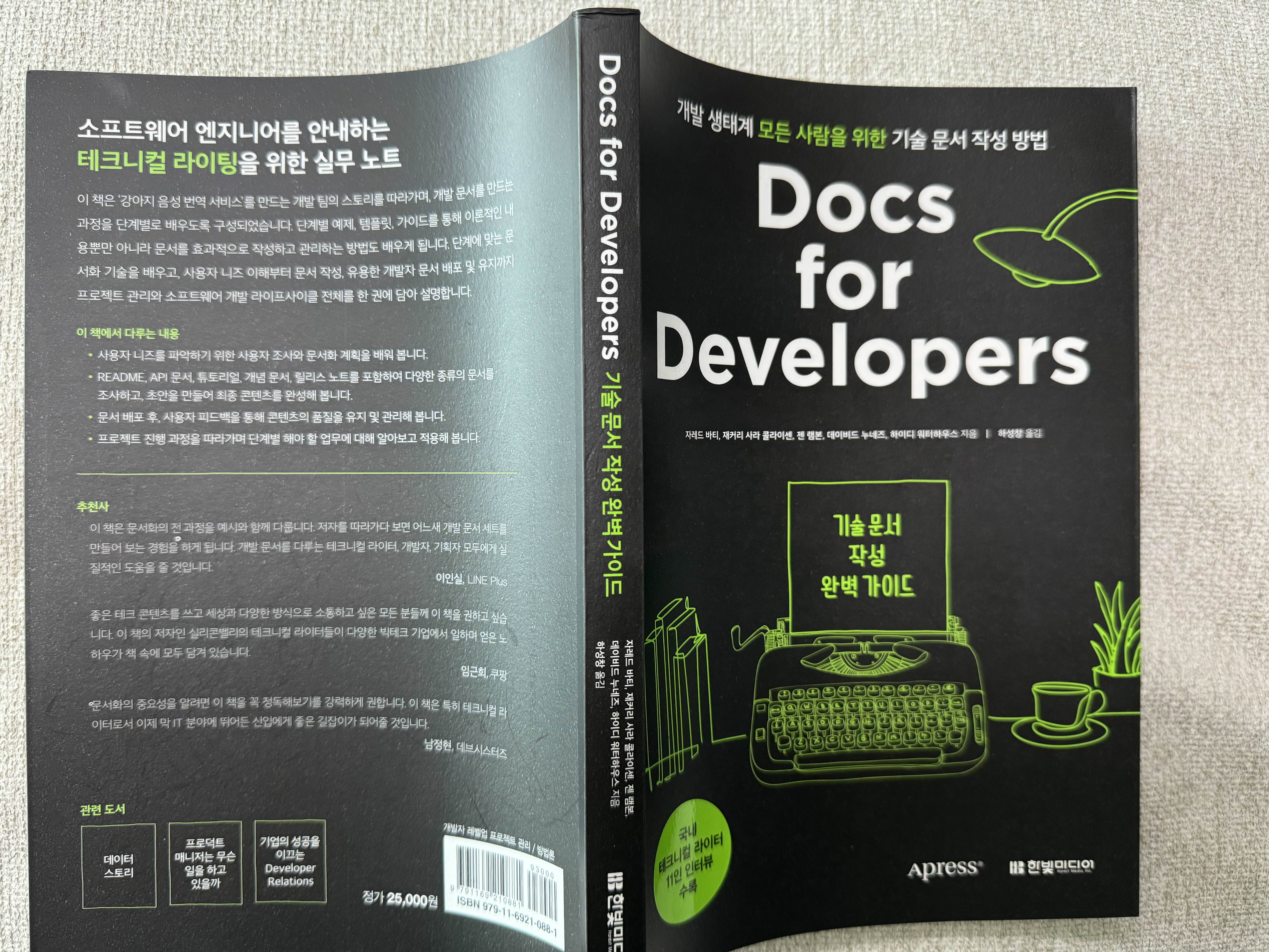 한빛미디어에서 개발 생태계에 모든 사람을 위한 기술 문서 작성 방법을 설명하는 Docs for Developers가 발간 됐습니다. 무릇 개발자라면 코드만 작성하는 것이 아니라 문서 작성도 해야 합니다. 본인이 개발한 코드를 설명하는 문서 혹은 릴리스 문서 등을 포함해서 말이죠. 그리고 글이 더 잘 소비되도록 문단 하나까지도 신경을 쓸 겁니다.