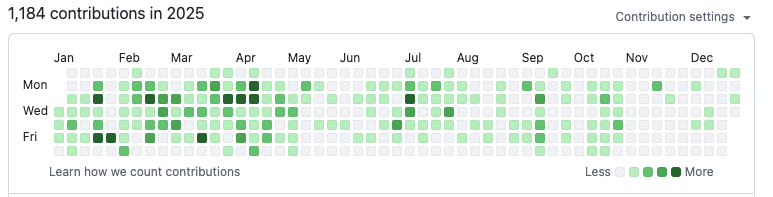 contributions 개수는 작년과 별반 차이가 없다. 구멍이 빠진 건 왜 때문일까? 휴가 말고는 잘 기억이 안 난다. 아마도 새로운 도구를 도입하기 위한 테스트 기간이 아니었을까 싶기도 하고.