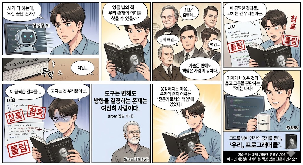 길벗에서 출판된 "우리, 프로그래머들"은 생성형 AI가 소스 코드를 쏟아내는 광경을 지켜보며 혼란을 느끼는 이 시대의 모든 개발자에게 던지는 묵직한 화두와도 같습니다. 많은 이들이 프로그래머의 종말을 예견하며, 기계가 인간보다 더 빠르고 정확하게 로직을 구현하는 시대에 과연 우리가 설 자리가 남아 있을지 의문이 드는 것도 무리는 아닙니다. 하지만 '클린 코드'의 저자로 잘 알려진 엉클 밥, 로버트 C. 마틴은 신작을 통해 이 불안한 질문의 방향을 완전히 뒤바꿔 놓습니다. 그는 기술의 변천사를 단순히 나열하는 데 그치지 않고, 지난 60년간 현장을 지켜온 노병의 시선으로 프로그래밍이라는 행위의 본질과 그 뒤에 숨은 인간의 정신을 집요하게 추적합니다. 저는 이 책을 읽으며 우리가 다루는 것이 단지 0과 1의 조합이 아니라, 인류의 문제를 해결하려는 숭고한 의지의 발현이었다는 사실을 다시금 깨달았습니다.