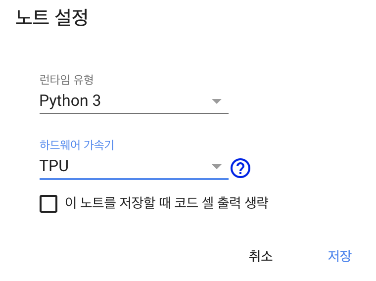 이후 출력되는 팝업에서 하드웨어 가속기를 TPU로 설정해줍니다.