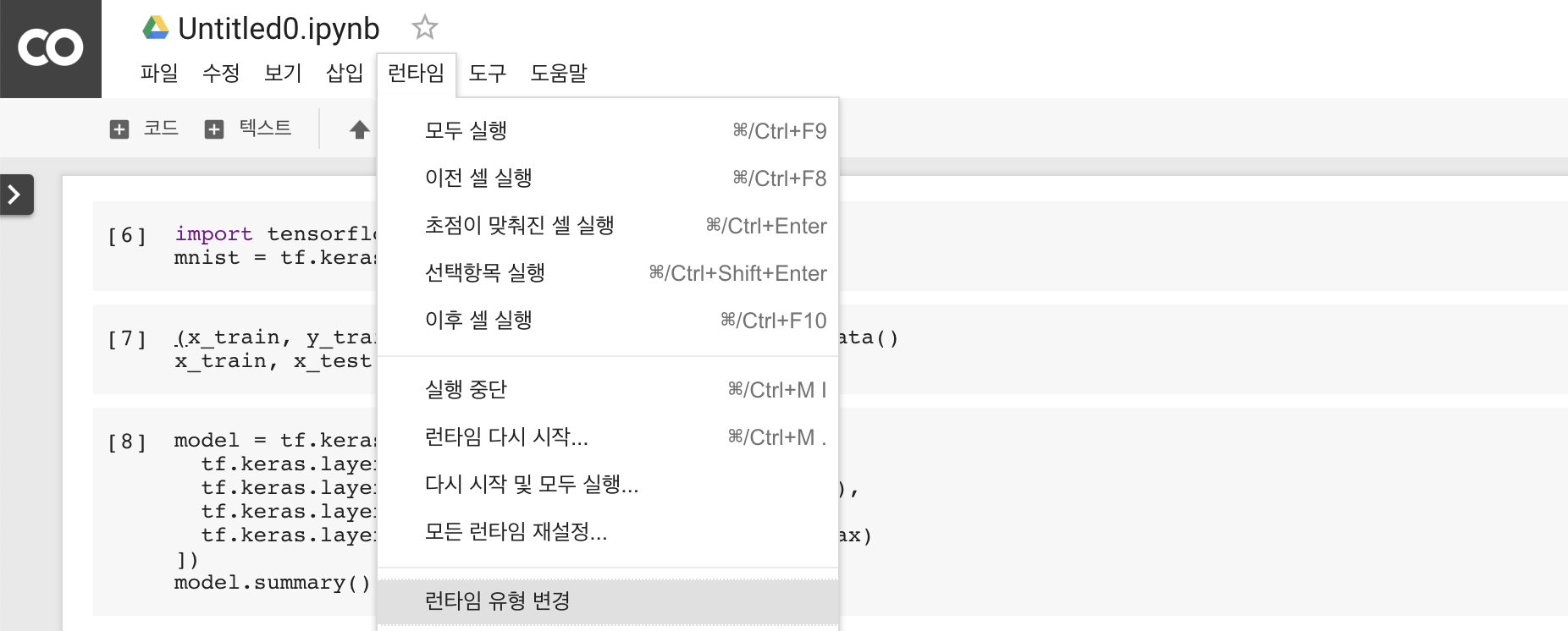 이 예제를 Colaboratory에서 TPU를 사용해서 돌려볼텐데 우선 Colab의 런타임 환경을 TPU로 변경해줘야합니다. 상단 메뉴바에서 [런타임 -> 런타임 설정]을 찾아서 클릭하도록 합니다.