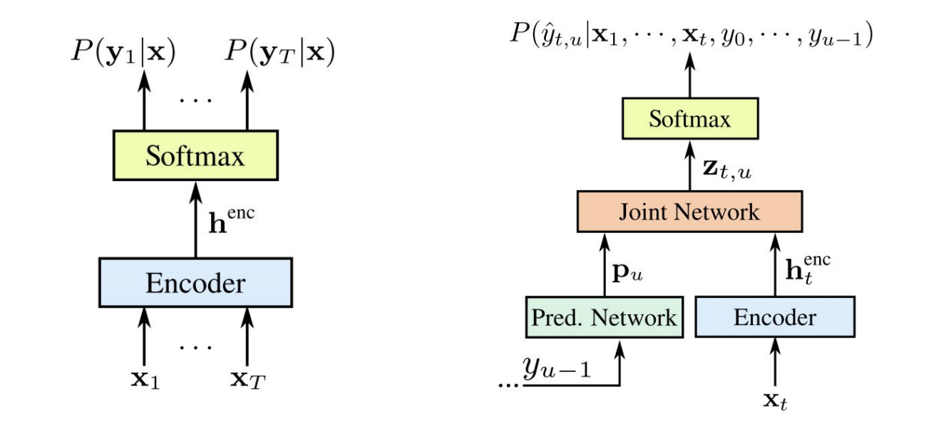 아무튼, Online models중에 대표되는 RNN-T를 살펴보면 아래 그림에서 그 개념을 잘 보여주고 있습니다. 기존 CTC 모델과의 차이를 보여주는 그림인데, Encoder에 Prediction Network를 연결해서 사용합니다. prediction network를 연결시켜줌으로써 후처리 언어모델의 효과를 얻을 수 있습니다.