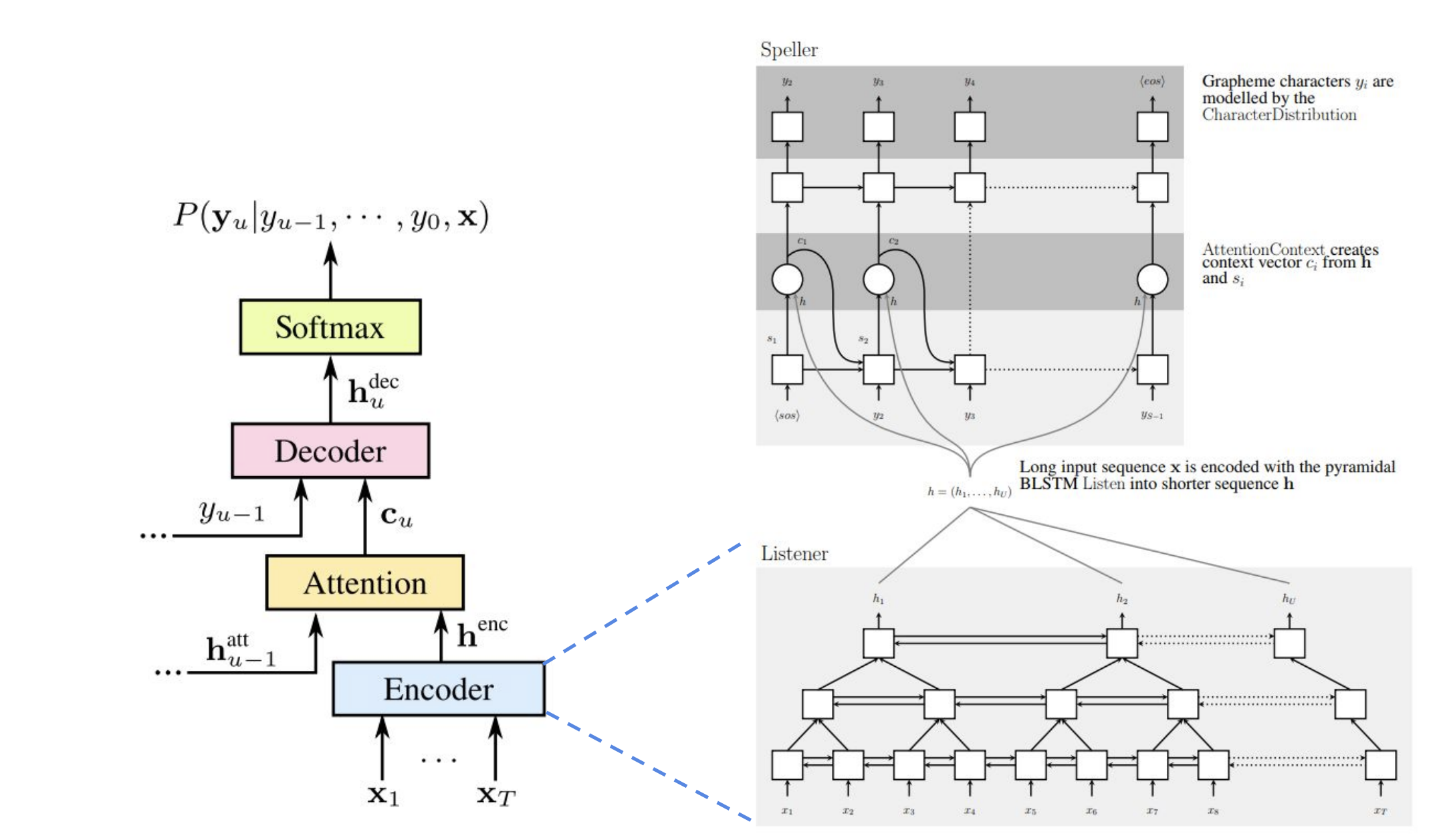 LAS의 개념은 아래 그림에서 잘 표현되고 있습니다. Listener, Attention, 그리고 Speller로 나눠지는 부분에 주목하면 됩니다.