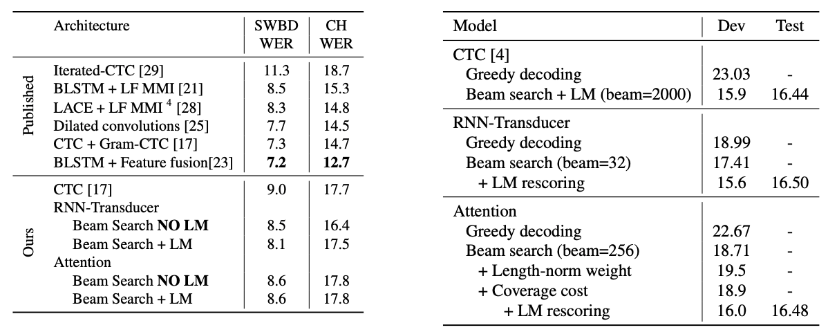 재밌는건 CTC-based를 제안했던 저자들이 Online Models을 새롭게 제시하고 있다는 사실입니다. Graves는 RNN-Transducer를, Jaitly는 NT를 각각 제안했네요. 아래 바이두에서 내놓은 자료에 따르면 CTC나 LAS 모델과 비교해서 RNN-Transducer의 인식률이 결코 밀리지 않는다는 주장을 하고 있습니다. 아직 명확하게 동일한 데이터를 기준으로 SOTA를 증명해낸 내용은 찾기 어렵지만요. (동일한 데이터 기준 : 예를들면 LibriSpeech나 WSJ같은)