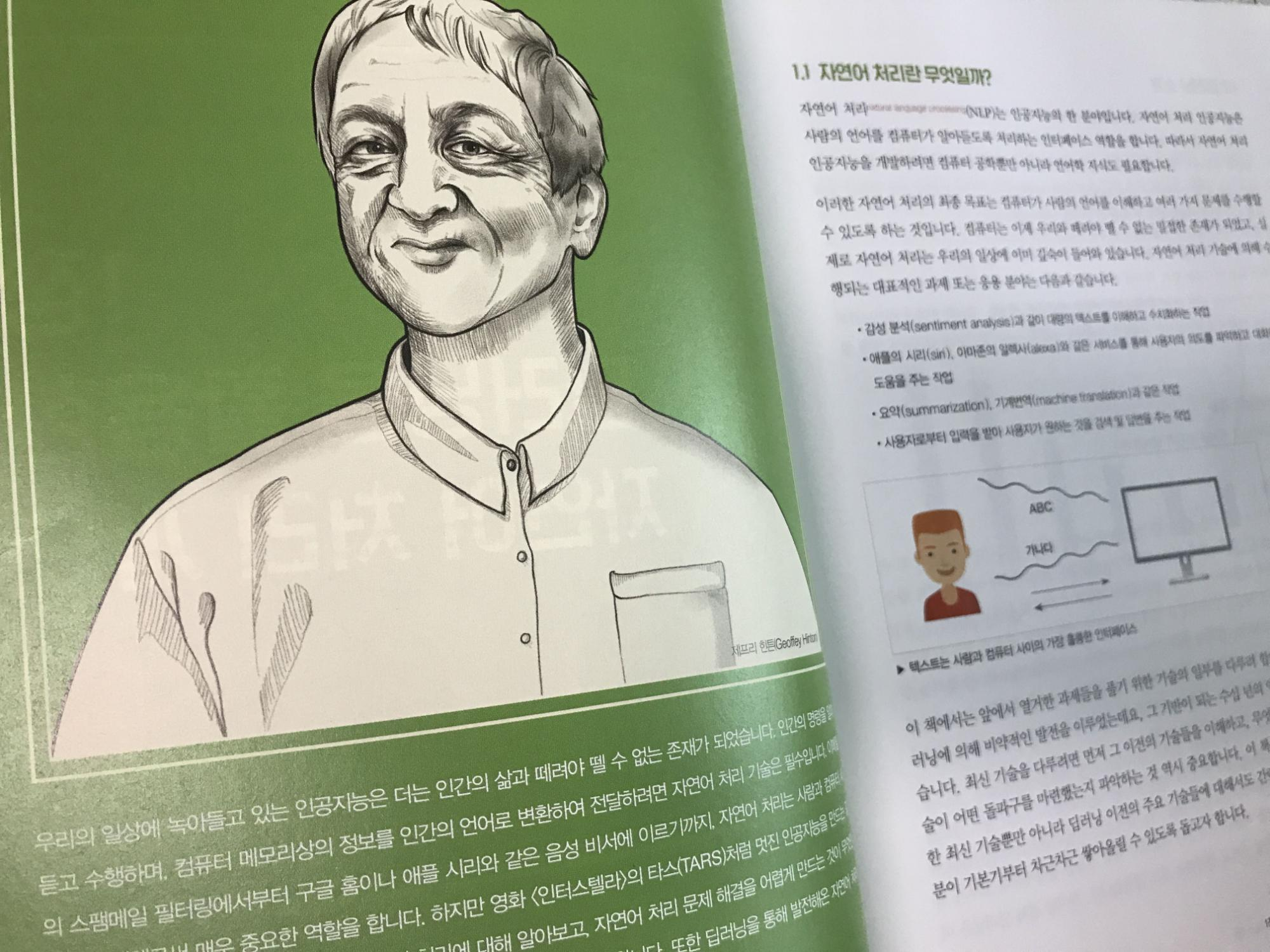 책의 모든 페이지가 컬러로 되어 있어서 꽤 세련된 느낌을 주고 패스트캠퍼스에서 진행한 강의가 바탕이 되어서인지 내용 구성이 좋아서 훌훌 잘 읽힙니다. 매 단원이 끝날때마다 딥러닝의 대가들(제프리 힌튼, 클로드 셰넌, 얀 르쿤 등)이 스케치 이미지로 등장하는데 누가 등장할지 궁금해서 더 빨리 읽게 되는것 같기도 합니다.