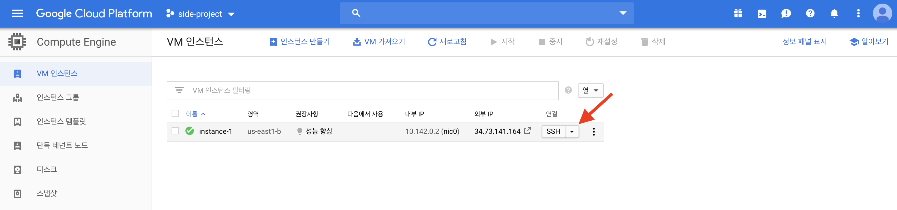 프로젝트가 정상적으로 선택 되었으면 SSH 접속을 위해 해당 프로젝트에 어떤 인스턴스가 존재하는지 확인 하도록 합니다.