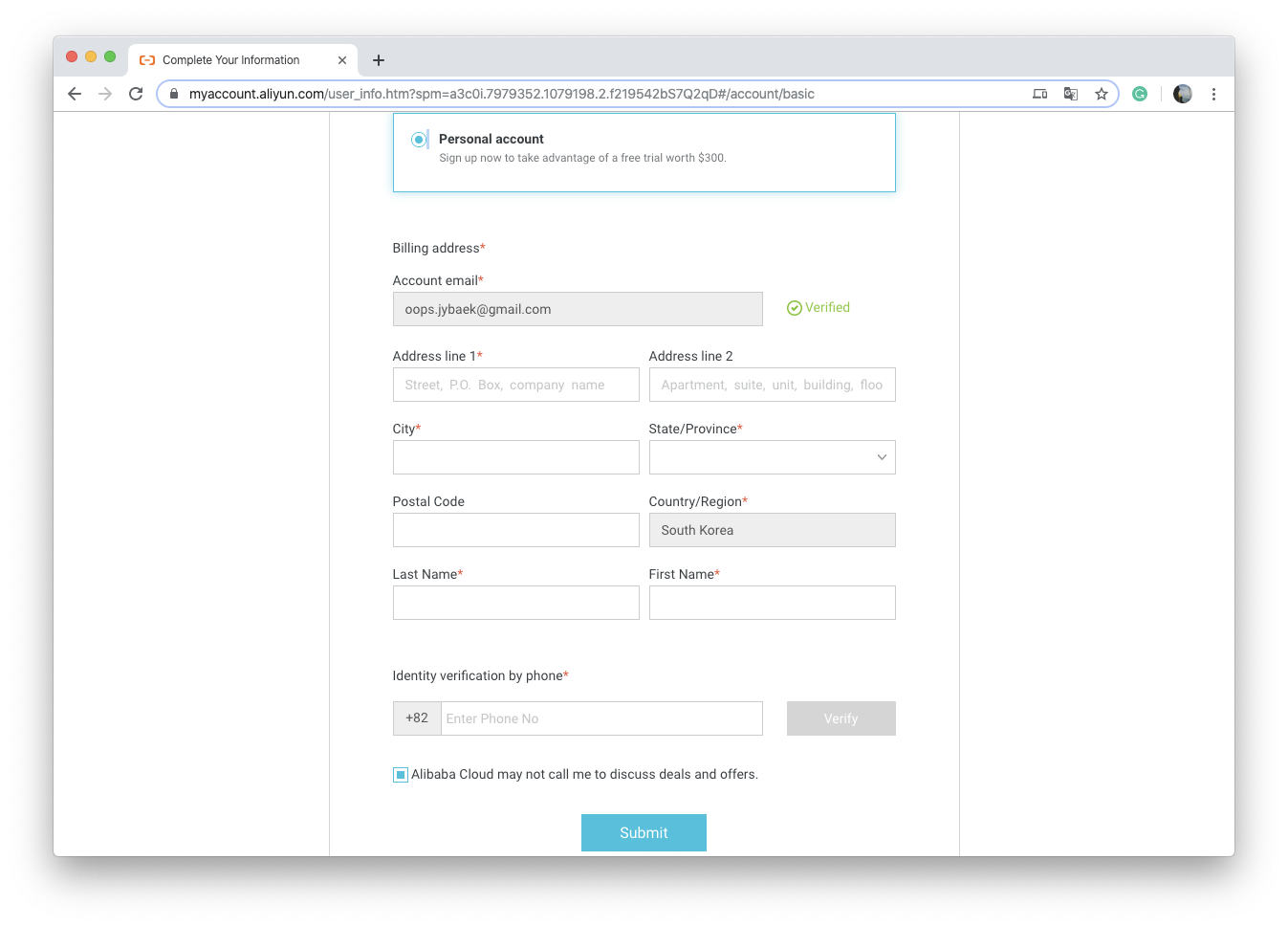 계정 타입을 개인 계정으로 선택하면 아래와 같이 개인정보를 입력하는 화면을 볼 수 있습니다.