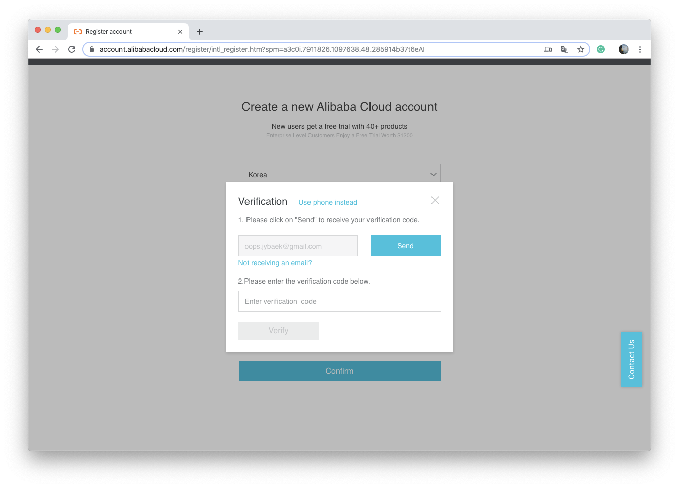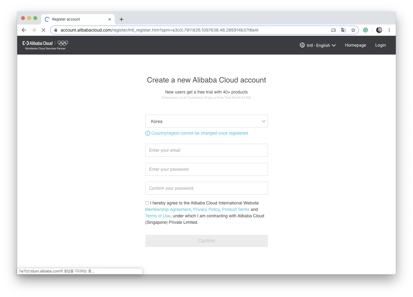 여기서는 이메일을 계정의 ID로 사용하는데요, 이때 이메일은 실제 유효한 주소여야 합니다. 그리고 패스워드는 해당 이메일의 실제 패스워드가 아니라, 알리바바 클라우드에서 사용할 계정에 대한 패스워드 입니다. 굳이 이메일의 실제 패스워드를 사용하지 마세요. 이제 이메일과 패스워드를 입력하고 약관에 동의한 이후 Confirm 버튼을 눌러줍니다.