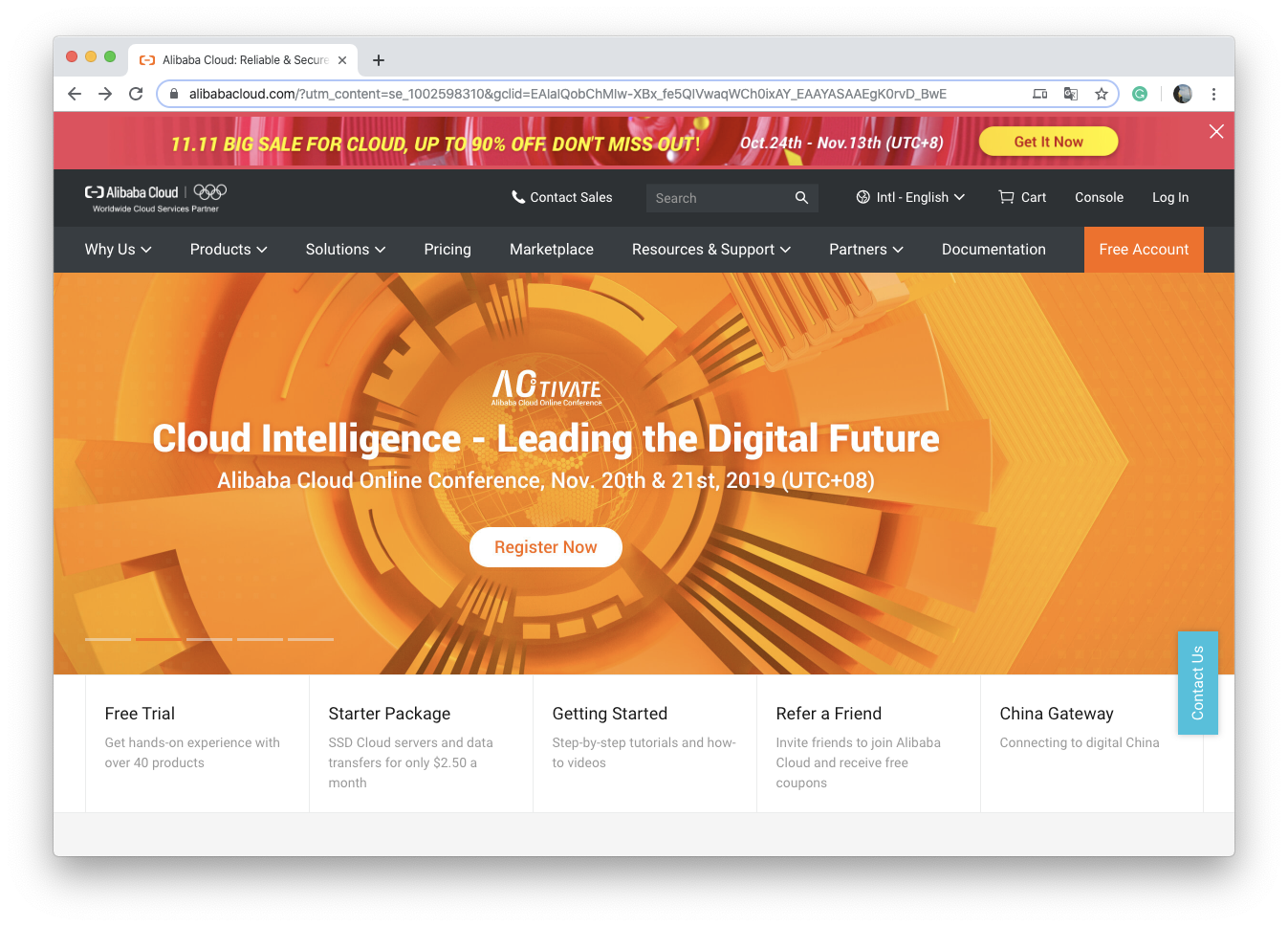 우선 알리바바 클라우드 페이지로 접속을 합니다. 아래와 같은 화면이 보일텐데 우측 상단에 Free Account를 통해 가입하도록 합시다.