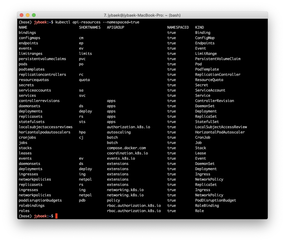클러스터가 이렇듯 물리적인 개념이라면 네임스페이스는 그 안에 들어있는 논리적인 분할 개념이 된다. 클러스터 안에는 N개의 네임스페이스가 존재할 수 있고, 논리적으로 나누어져있지만 공용 인터페이스를 통해 서로 다른 네임스페이스간 통신이 허용된다. 그럼 네임스페이스는 언제 사용하는게 좋을까? 거대한 클러스터 자원을 복수의 사용자가 나눠서 사용할 때 유용하다. 그렇지 않은 경우에는 네임스페이스는 고려할 필요가 전혀 없다. 한편 위에서 이야기한 대부분의 컴포넌트 단위는 네임스페이스에 종속되기 때문에 네임스페이스가 변경되면 접근이 안된다는 점을 인지해야 한다. 네임스페이스에 속하는지 여부는 kubectl api-resources --namespaced=true 혹은 --namespaced=false 로 확인 할 수 있다.