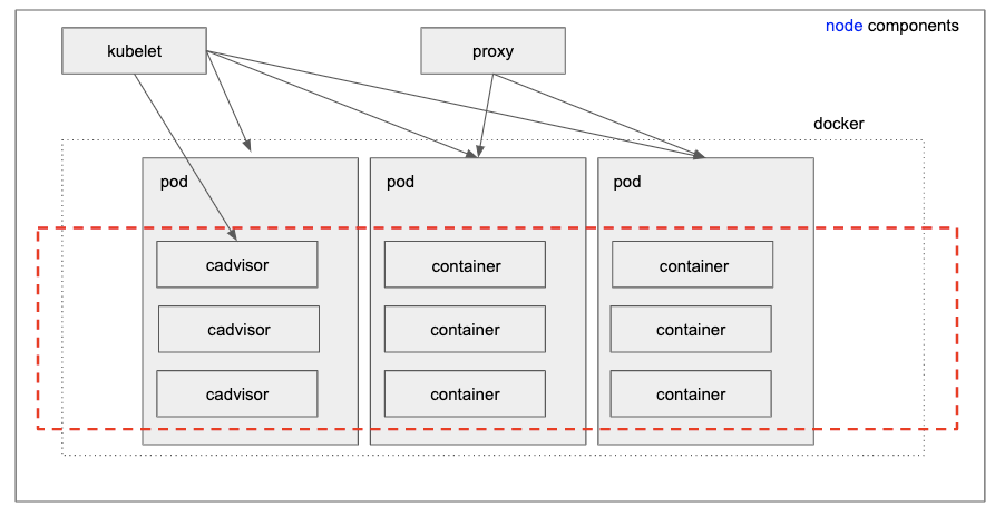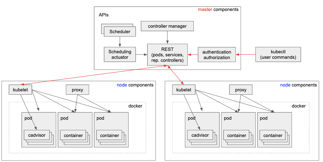 kubectl을 통해 입력되는 명령어는 마스터로 전달되고 REST 컴포넌트에서 각 워커노드의 kubelet에 의해 pod까지 전파된다. 예를들어 kubectl get pods 명령으로 전체 pods를 가져온다고 생각하면 다음과 같이 빨간색 화살표처럼 전파될 것이다. 이를통해 우리는 노드에 있는 kubelet이 각 파드의 상태를 알고 있으며 마스터와 통신해서 파드를 제어할 수 있게 해준다는 사실을 알 수 있다.