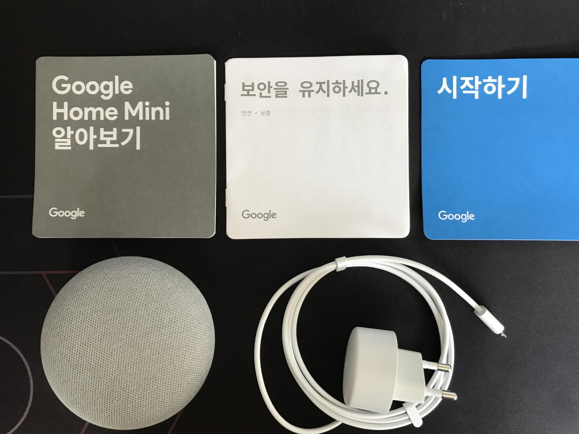 꺼내어보면 아래와 같은 구성품이 들어있다. 설명서는 최소한의 내용만 담고 있기 때문에 별 도움이 안 된다. 그리고 구글 홈 미니는 전력이 항상 공급되어야 하는 모델로, 충전해놓고 사용하는 방식이 아니다.