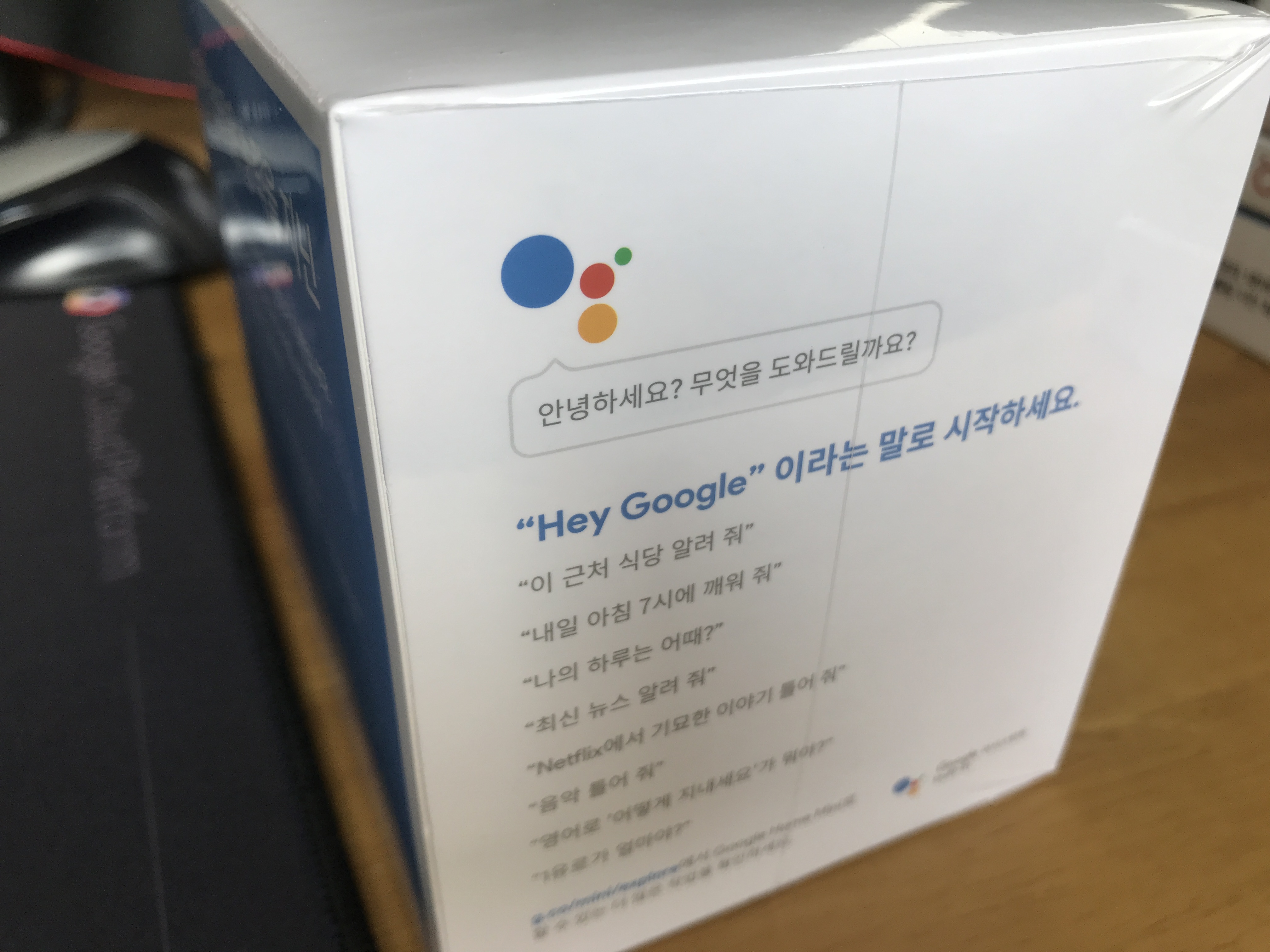 박스에 아주 기본적인 사용 설명이 있는데 인공지능 스피커를 사용해보지 않은 사람들에게 어떻게 말을 걸면 되는지 정도의 가이드를 해주고 있다. "헤이 구글"이라는 소리에 반응하고 그다음에 오는 문장을 명령으로 인식한다.