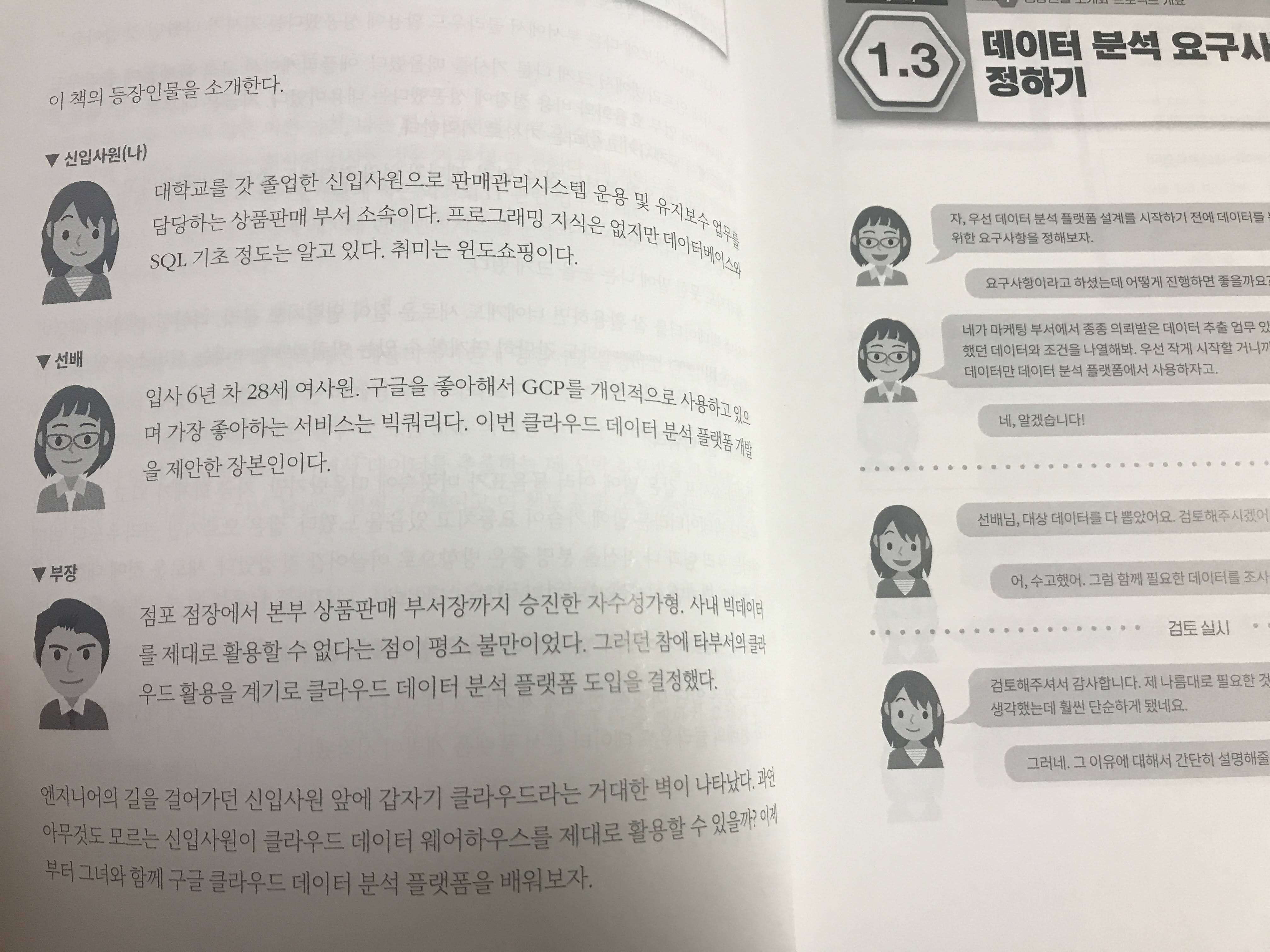 책은 독특하게 구성되어 있다. 신입사원이 선배에게 GCP의 여러 서비스를 배워가며 데이터 웨어하우스를 구축하는 컨셉으로 구성되어 있다. 웨어하우스 구축 미션을 단계적으로 수행하는 과정을 서술하고 있다고 보면 된다. 여기서 함께 공부하는 느낌을 받을 수 있다 (웃음)