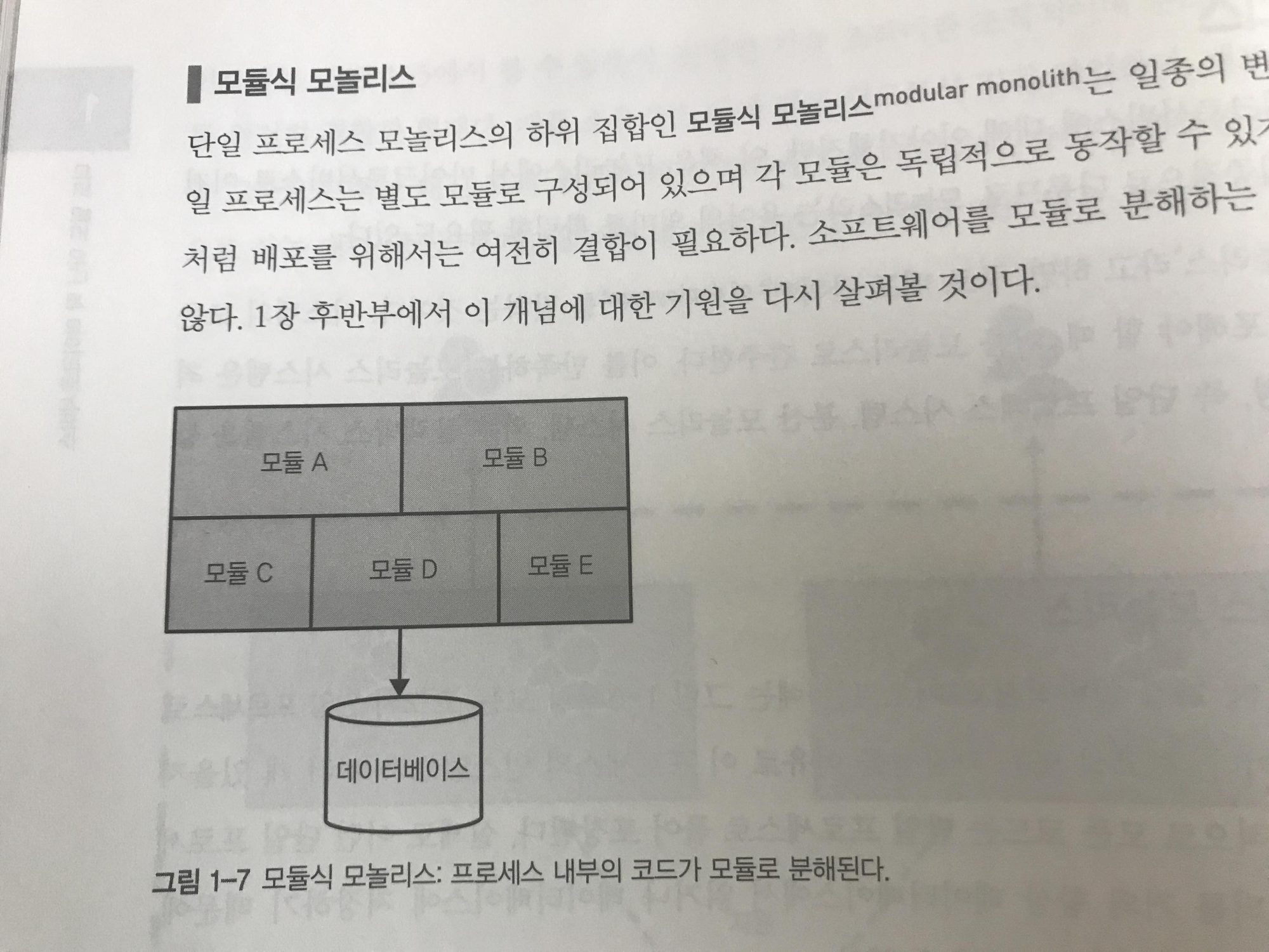 혹시 모놀리스 == 레거시로 취급하지는 않으셨나요? 요즘이야 레거시라는 용어에 대한 인식도 많이 바뀌었지요. 레거시는 과거의 유산으로, 그때 당시 최선의 결과물이었을 테니까요. 모놀리스는 훌륭합니다. 책에서도 설명하고 있지만 서비스 MVP를 빠르게 만들어서 검토하는 과정에서 MSA는 분명 사치입니다. 일을 훨씬 더 복잡하게 만들 겁니다. 또한 서비스가 궤도에 올라갔다고 해도 모놀리스 때문에 발생하는 문제는 사실 상당히 적습니다. 특히 데이터베이스 부하 문제가 자주 언급되는데 그건 시스템을 그렇게 설계&개발한 게 문제지 모놀리스 잘못이 아니거든요. 또한 모놀리스도 단일 프로세스 모놀리스, 모듈식 모놀리스(modular monolith), 분산 모놀리스(distributed monolith)로 나눠지는데 잘 설계됐다면 MSA가 필요한 상황은 오지 않을 겁니다. 하지만 대부분은 모놀리스 = 모듈식 모놀리스로 인식됩니다.