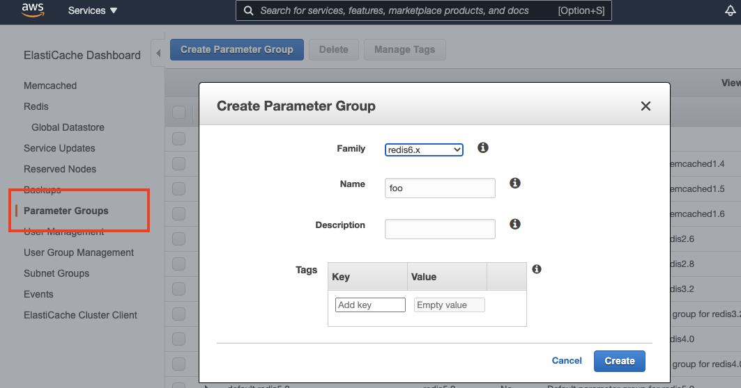 이제 notify-keyspace-events 설정을 변경하려면 default.redis5.0을 찾아가서 변경해주면 될 것 같지만 그렇지 않습니다. AWS에서 제공하는 default는 수정이 불가능하거든요. 그렇기 때문에 사용자가 Parameter Group을 생성하고 Redis Cluster에 지정해줘야 합니다.