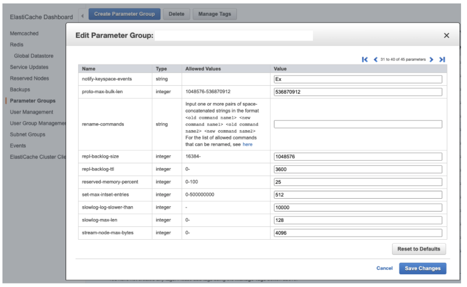 그런데 AWS에서 ElastiCache를 통해 제공되는 Redis는 redis cli에서 설정 변경이 불가능합니다. 대신 AWS 콘솔을 통해 변경해야 할 수 있습니다. AWS 상에서는 Parameter Group이라는 이름으로 설정을 저장해놓고 사용하게 됩니다. 여러분의 Redis에 설정된 Parameter Group을 아래처럼 확인해보세요.