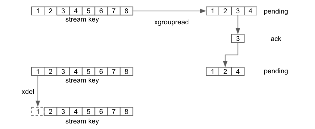 stream을 사용하는 대략적인 명령어를 살펴봤습니다. stream key를 xgroupread를 통해서 읽어 들이고, 읽어 들인 항목은 pending 상태를 유지하며 ack를 받게 되면 pending 목록에서 제거되는 일련의 과정은 아래 그림처럼 표현할 수 있습니다.
