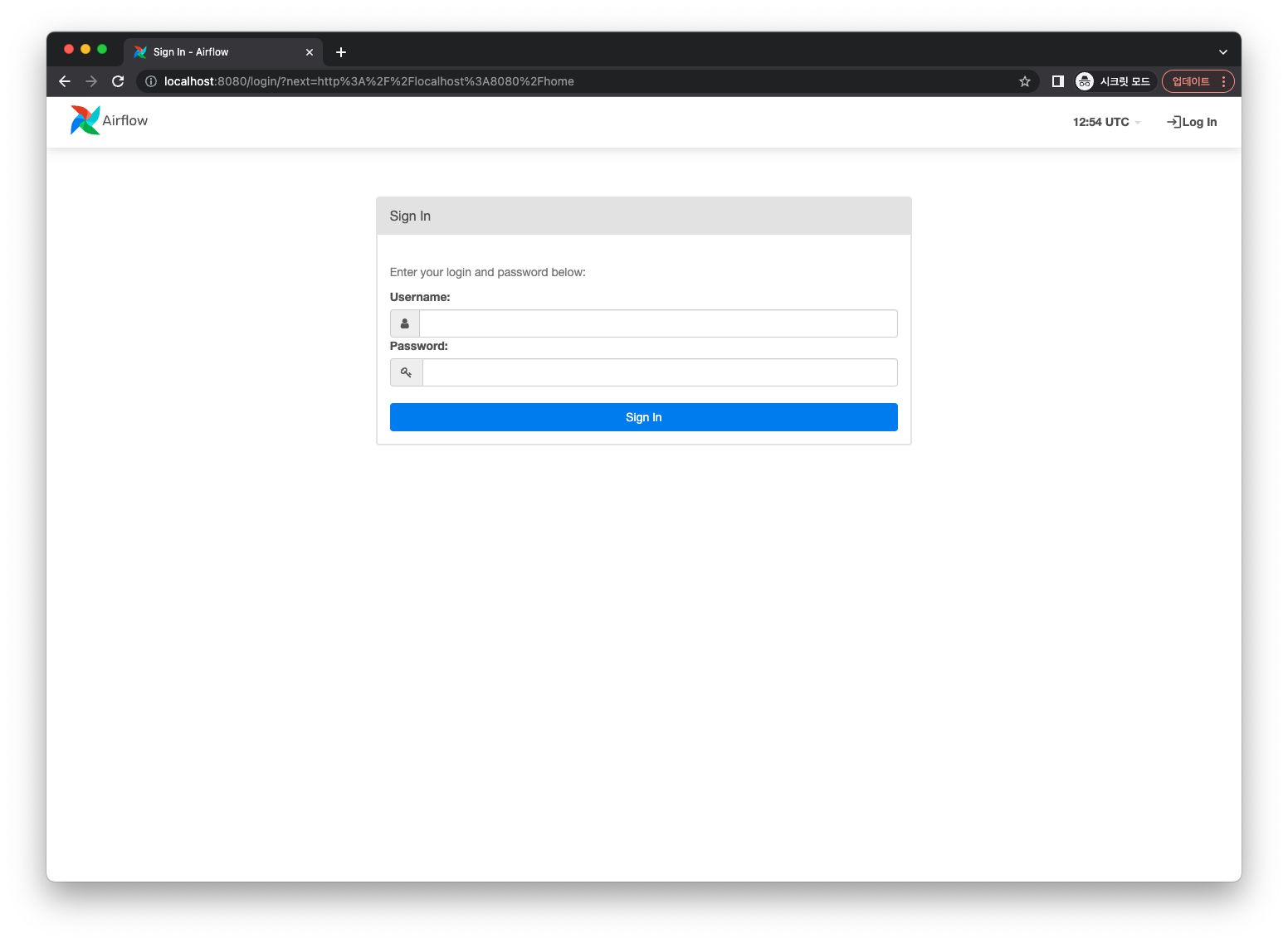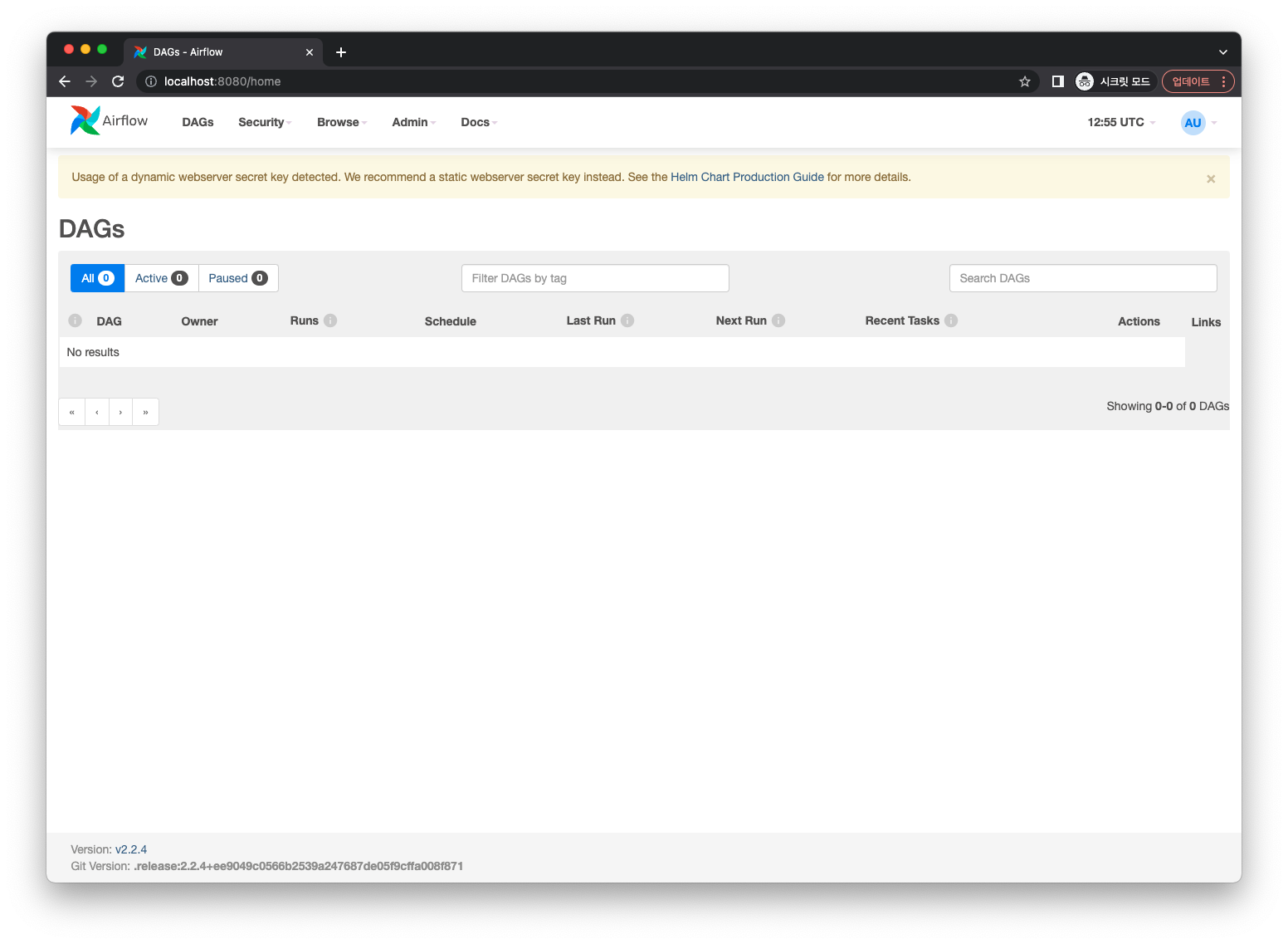 서버 접속에 성공했습니다. 여기까지가 기본코스입니다. 현재 airflow에서 사용되는 Executor는 CeleryExecutor입니다. 다음 글에서는 Executor를 KubernetesExecutor로 변경하는 과정을 살펴보도록 하겠습니다.