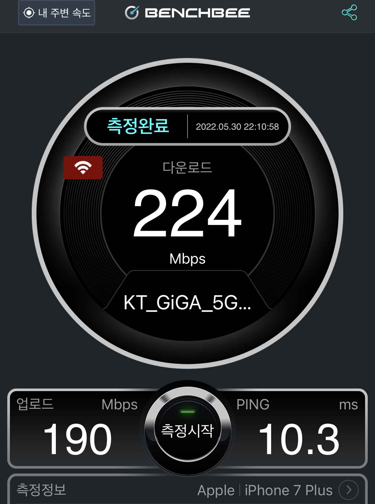 아무튼 각설하고 KT 500MB를 선택했다. 스마트 TV가 아니다 보니 그동안 애플 TV를 통해서 핸드폰을 미러링 해서 웨이브, 티빙을 시청했었는데 이제 애플 TV가 필요 없게 됐다. 벤치비를 통해 5G 무선 속도를 측정해보니 기존보다 3~5배 이상 빨라졌다. 5G 특성 때문에 공유기로부터 거리가 멀어지면(공간이 분리되면) 속도가 떨어지긴 하지만 그것도 이전에 비해서 훨씬 빨라진 상태다.
