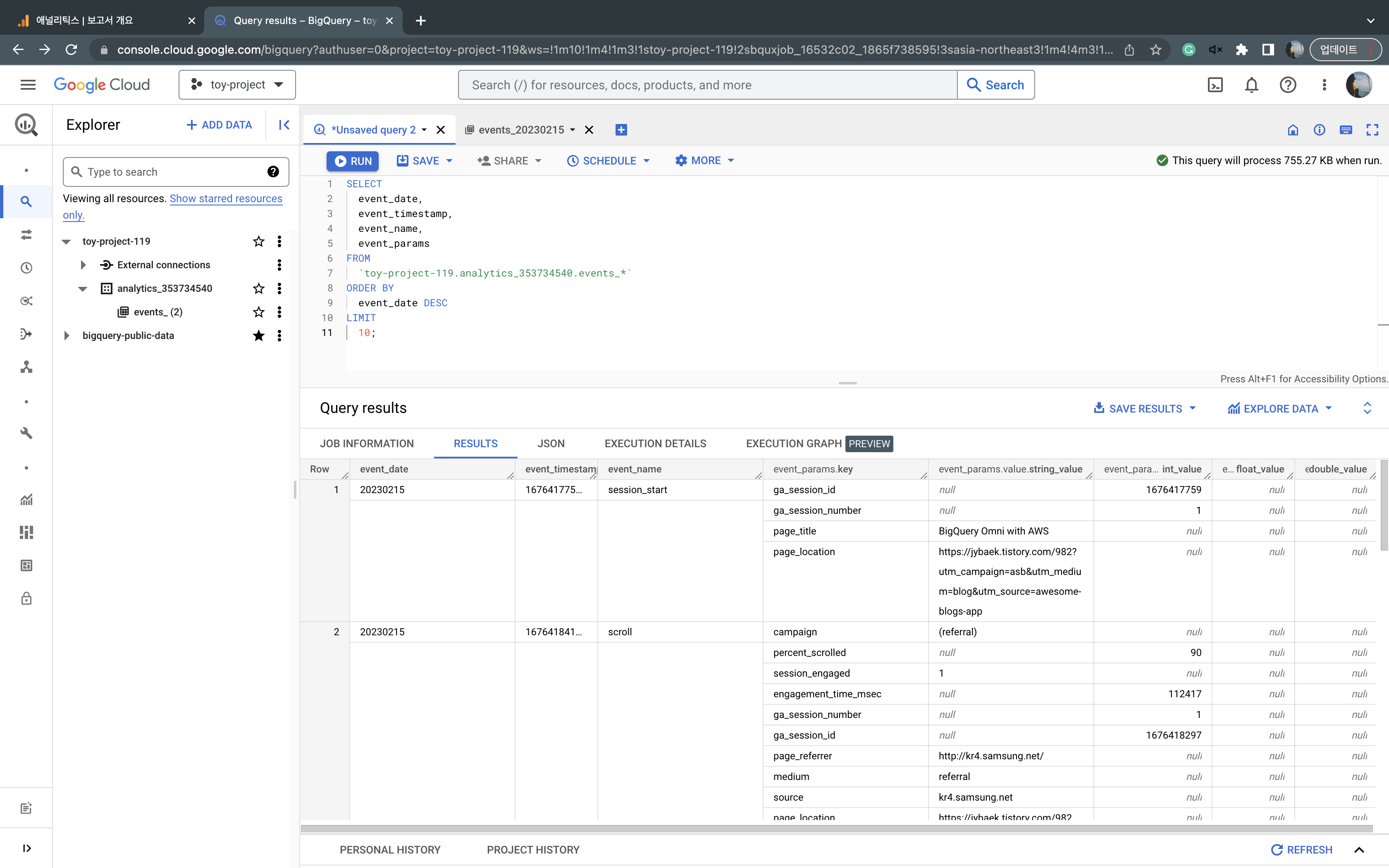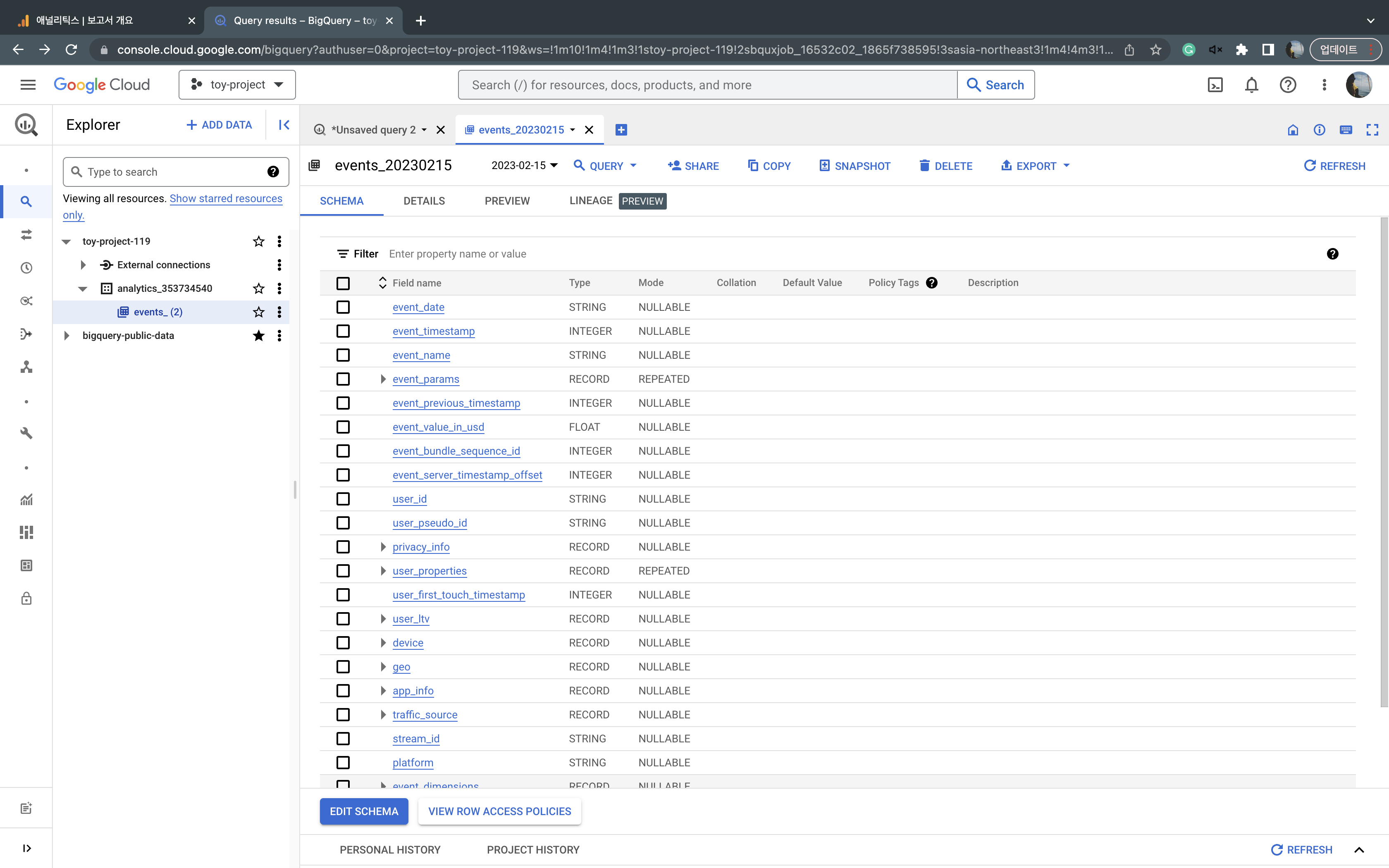 이제 기다렸다가 BigQuery에 데이터가 정상적으로 적재되는지 확인하시면 됩니다. 데이터가 적재되면 아래와 같이 GA4 스키마를 확인하실 수 있습니다.