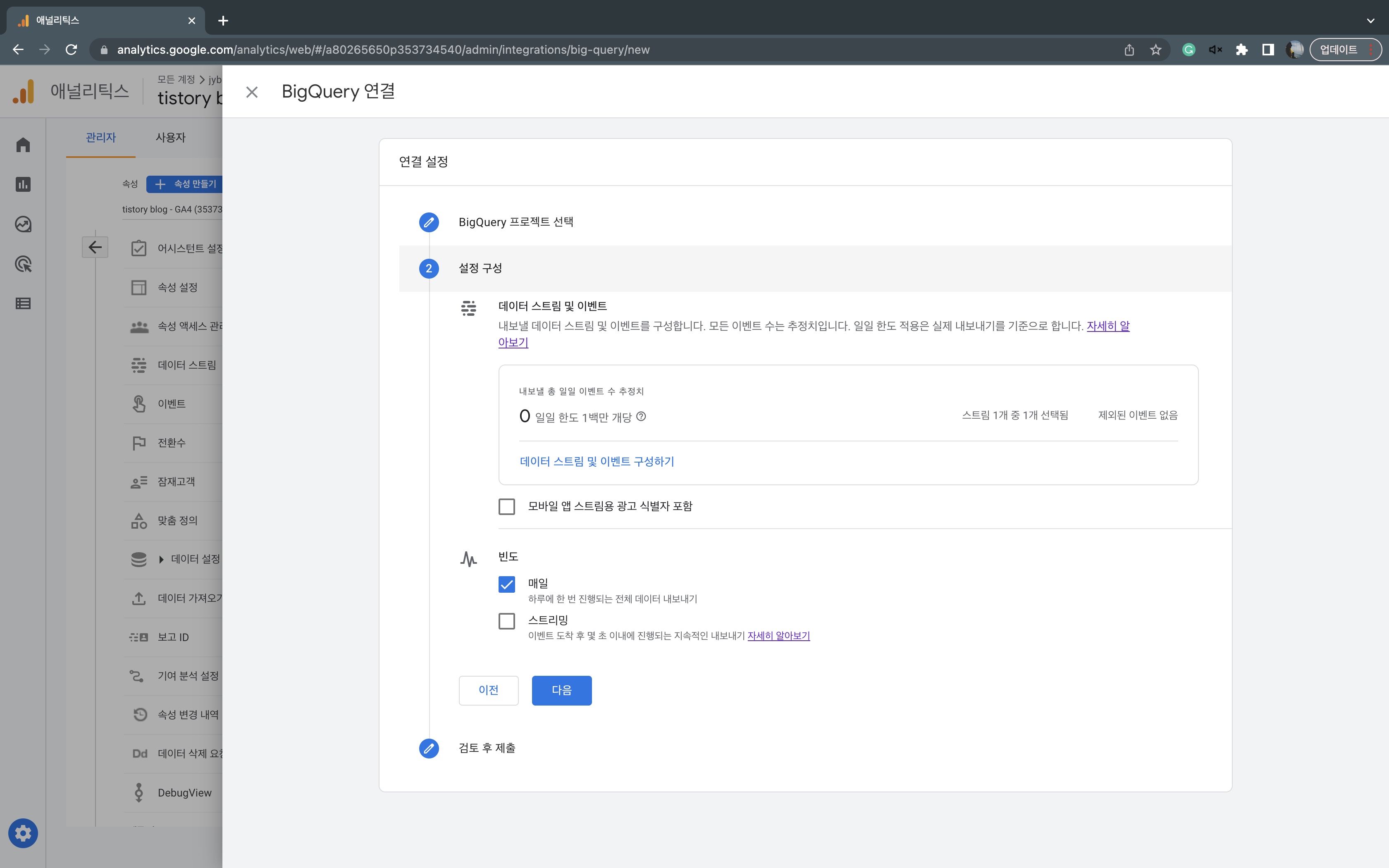 이제 BigQuery에 데이터를 전송할 빈도를 선택하게 됩니다. 하루에 한 번 전송하는 방식과 스트리밍 방식을 선택할 수 있는데 기본적으로 BigQuery 무료 계정 사용자에게는 스트리밍 방식은 지원되지 않습니다. 그리고 쌓이는 데이터 생김새도 조금 다른데, 스트리밍의 경우 지속적으로 데이터를 쌓기 때문에 테이블 이름이 YYYYMMDD로 끝나지 않습니다. 테이블을 더 짧은 시간 단위로 구성해서 데이터를 적재하다가 그날의 마지막 이벤트가 적재되면 해당 테이블들의 데이터는 삭제하고 YYYYMMDD 테이블로 만들어줍니다.