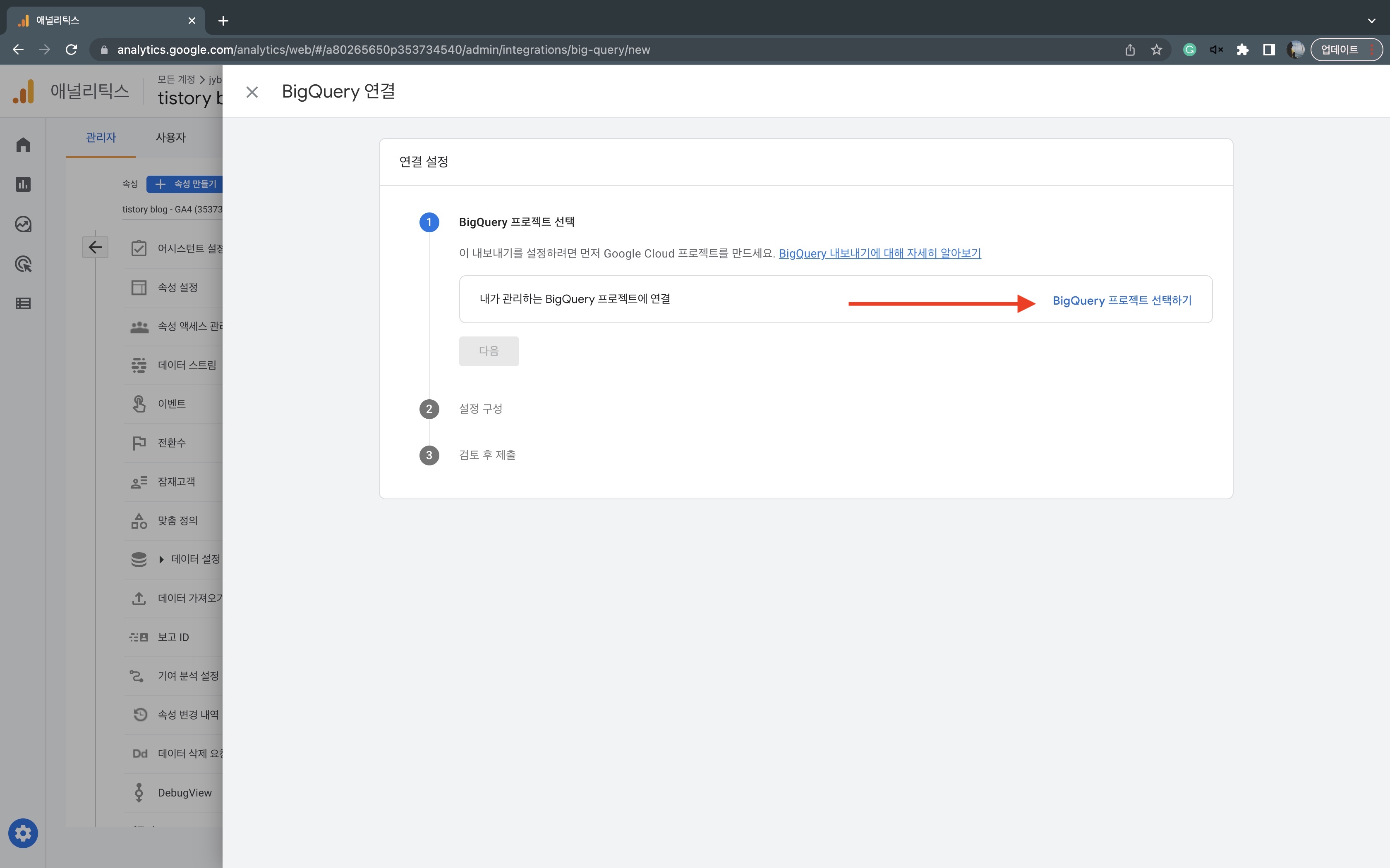 스크롤을 아래로 내려보면 "BigQuery에 연결" 문구를 찾으실 수 있을 겁니다. 오른쪽에 화살표를 누르고 메뉴를 펼쳐서 "BigQuery 연결 설정"까지 클릭해 줍시다.
